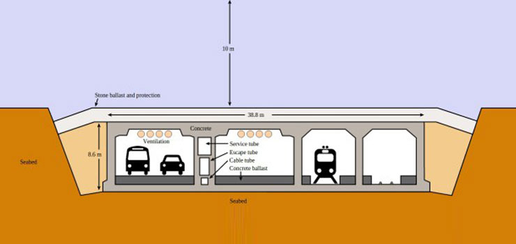 Los 49 tableros que constituyen la totalidad de los vanos de aproximación al puente atirantado fueron construidos en Puerto Real, Cádiz (España), por la empresa española Dragados Offshore que también se encargó de transportarlos por vía marítima hasta el lugar indicado y, una vez allí, hundirlos. Se construyó en forma de túnel, isla y puente, ya que todo el tramo de 16 km de túnel hubiera resultado demasiado caro. Y no se construyeron 16 km de puente porque se tenía que asegurar la aeronavegabilidad de la zona, pues el aeropuerto de Kastrup (Aeropuerto Internacional de Copenhague) está situado junto a la entrada actual del túnel. Las torres del puente fueron colocadas por la grúa flotante más grande del mundo y están diseñadas para que el puente no se destruya ni en caso de una colisión aérea contra las torres.